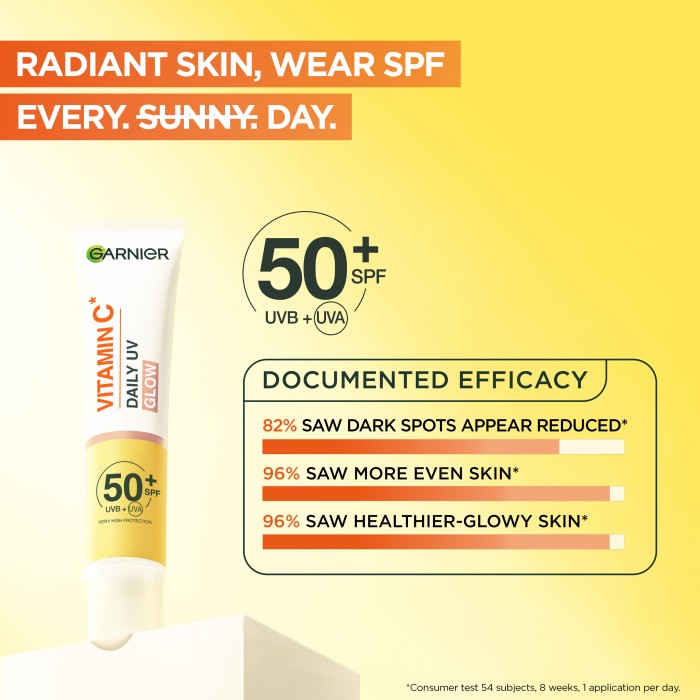 Garnier Skin Active Vitamin C* Glow Boosting Daily UV Fluid SPF50+ är en lätt och flytande dagkräm som återfuktar huden hela dagen. Dagkrämen innehåller SPF50+ för att ge ett skydd mot UVB, UVA och långa UVA-strålar för att förebygga uppkomsten av mörka fläckar på huden. Krämen är berikad med C-vitamin* för att ge huden en fin lyster.