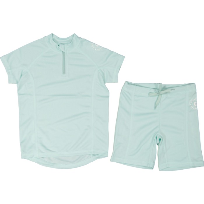 Geggamoja UV-set med kortärmad tröja och korta byxor. Tröjan har en dragkejda fram i halsen för att vara enkel att ta på. Tröjan och byxorna är tillverkade i ett snabbtorkande material, och har UV-50+ som blockerar 98% av solens UVA- och UVB-strålar. Använd för att skydda barnets hud från solen strålar när ni är vid poolen och på stranden.