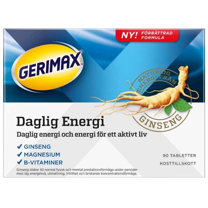Gerimax Daglig Energi är ett kosttillskott som innehåller ginseng, vitaminer och mineraler.