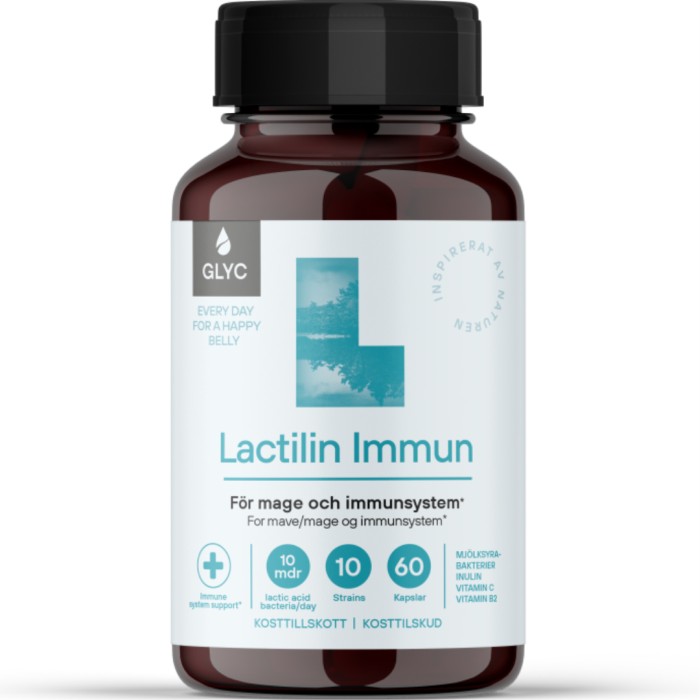 GLYC Lactilin Immun är ett kosttillskott som innehåller 10 miljarder CFU levande mjölksyrabakterier från 10 noga utvalda stammar. Lactilin Immun innehåller även vitamin C, vitamin B12 och kalcium. Vitamin C bidrar till immunsystemets normala funktion och att skydda kroppen mot fria radikaler och oxidativ stress. Vitamin B2 bidrar till normala slemhinnor och normal ämnesomsättning, och en normal energiproduktion i kroppen. Kalcium bidrar till den normala funktionen av matsmältningsenzymerna. GLYC Lactilin Immun innehåller också inulin.
