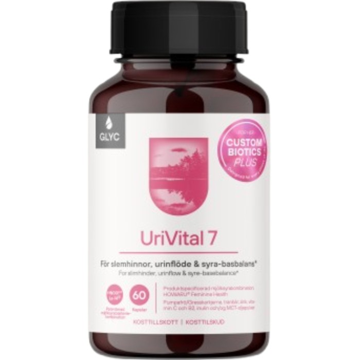 GLYC UriVital7 är ett kosttillskott som innehåller den patenterade mjölksyrabakterie-kombinationen HOWARU® Feminine Health med Lactobacillus acidophilus La-14® (8 miljarder CFU) och Lacticaseibacillus rhamnosus HN001™ (2 miljarder CFU). UriVital7 innehåller också pumpafrö och zink. Zink bidrar till normal syra-basbalans. Vitamin C bidrar till att skydda celler från oxidativ stress och riboflavin hjälper till att bibehålla normala slemhinnor. Detta kosttillskott innehåller även inulin och tranbär. GLYC UriVital 7 är en del av serien "CustomBiotics Plus".