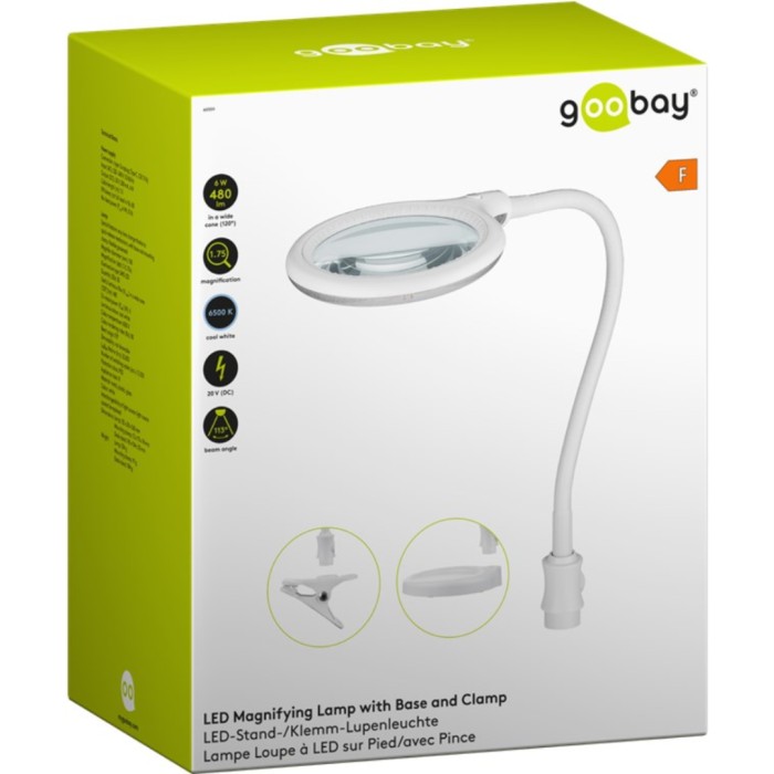 Goobay Förstoringsglas med klämma är ett praktiskt förstoringsglas med inbyggd LED-belysning. Detta förstoringsglas levereras med både en klämma och en platta för att förenkla fastsättning och användning. Klämman har en mjuk yta för aytt inte lämna några märken när man använder den för att sätta fast förstoingsglaset.