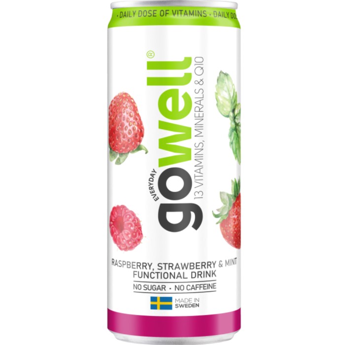Gowell är en lätt kolsyrad funktionsdryck som är tillverkad i Sverige och som innehåller 13 vitaminer, mineraler och antioxidanter.