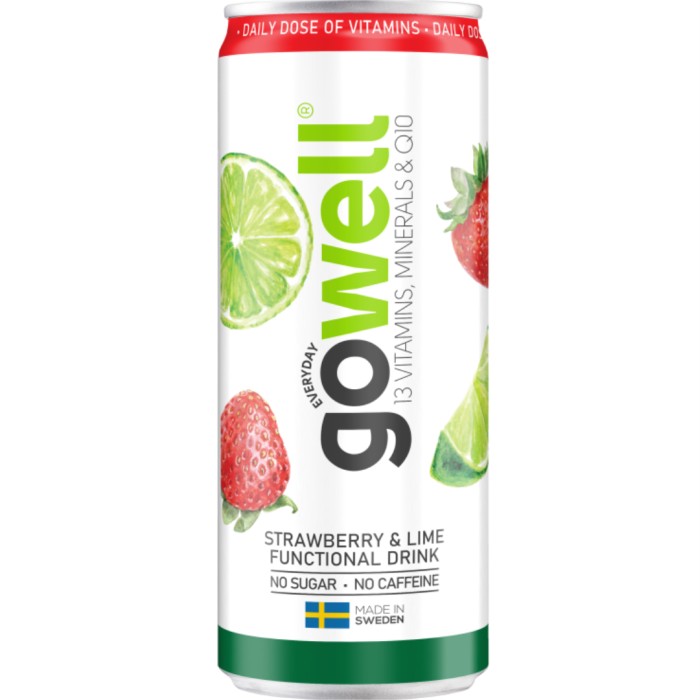 Gowell är en lätt kolsyrad funktionsdryck som är tillverkad i Sverige och som innehåller 13 vitaminer, mineraler och antioxidanter.
