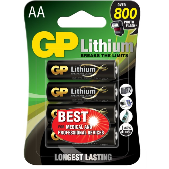 GP Lithium är ett av dom kraftfullaste och stabilaste batterierna på marknaden. Passar till professionella produkter såsom medicinteknisk utrustning och är 40% lättare än ett vanligt alkaliskt batteri. Bland fördelarna med litiumbatterier finns att de håller hög och stabil prestanda oavsett temperatur (fungerar i temperaturer -40° C till +60° C) och har upp till 10 års livslängd.