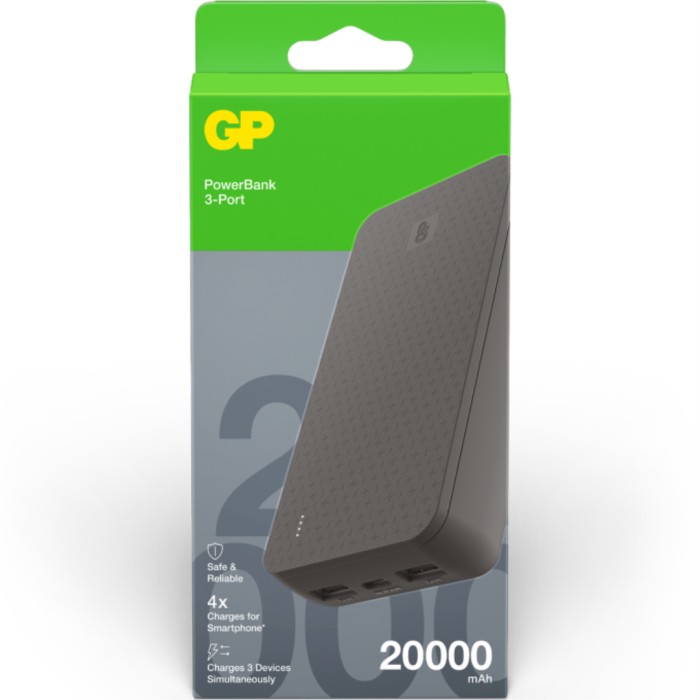 GP Plus Series Powerbank 20000 mAh är en kraftfull powerbank med en kapacitet på 20 000 mAh som gör att du kan ladda din telefon upp till 4 gånger*. En USB-C-port och två USB-A-portar gör det möjligt att ladda tre enheter samtidigt.