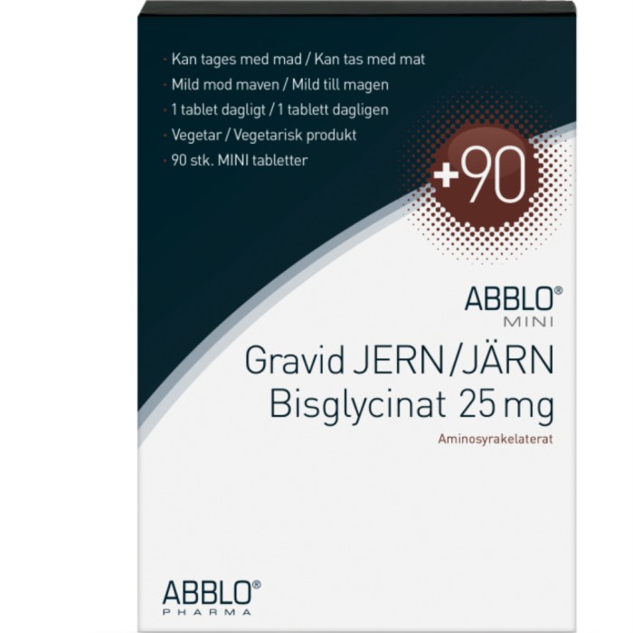Gravid Järn från Abblo Pharma är ett kosttillskott med 25 mg aminosyrakelaterat järn per tablett vilket motsvarar 50 mg järnsulfat. Järn bidrar till att minska trötthet och utmattning, och har en roll i celldelningsprocessen.