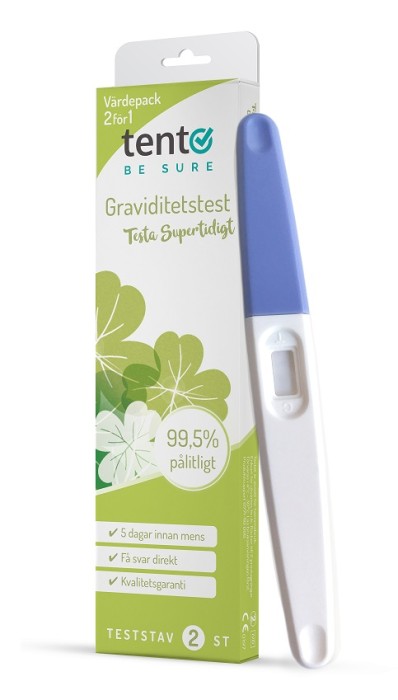 Detta är Tentos mest känsliga test, känslighet är 10mlU/ml hCG. Produktion av hormonet hCG (Humant Choriogonadotropin) påbörjas kort efter att befruktningen har ägt rum. Testet ger 99,5 % rättvisande resultat. För att använda detta test behövs endast att urinstrålen träffar teststickan, men du kan även doppa staven i en behållare med uppsamlad urin. Testet kan sedan avläsas inom några sekunder.