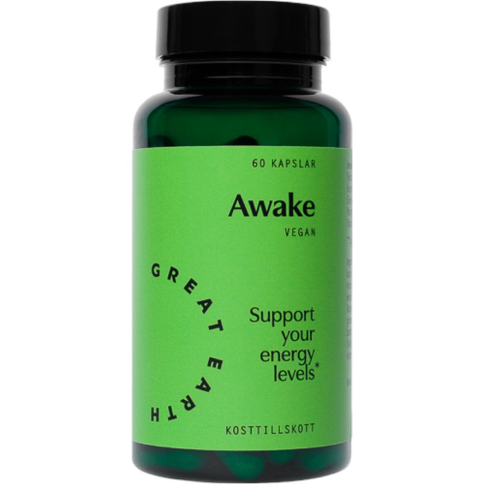 Great Earth Awake är ett kosttillskott som innehåller adaptogener som ginseng, rosenrot och rysk rot. Rysk rot kallas även sibirisk ginseng och har använts i mer än 2000 år. Awake innehåller även pantotensyra och vitamin B12 som bidrar till normal energiomsättning och till minskad trötthet och utmattning.