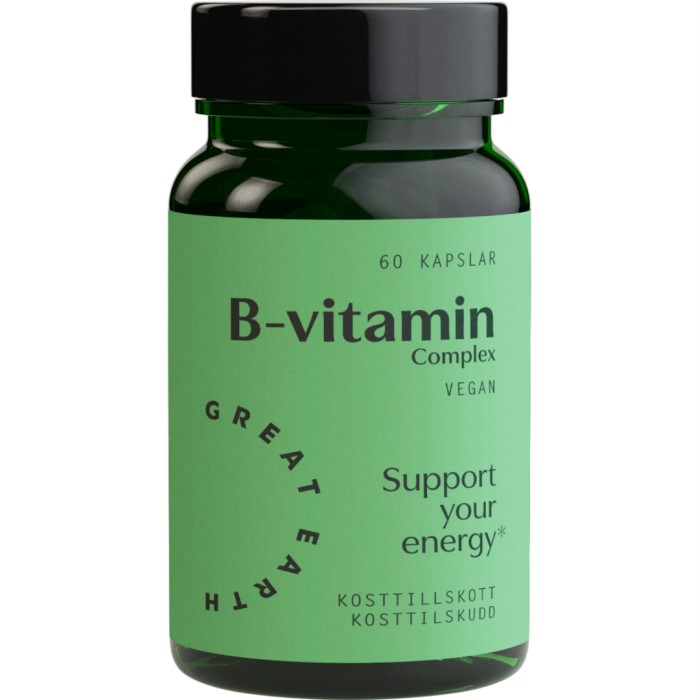 Great Earth B-vitamin Complex är ett kosttillskott som innehåller alla 8 essentiella B-vitaminer som kroppen behöver. Vitamin B2 och B12 bidrar till att minska trötthet och utmattning, medan vitamin B1 och B6 bidrar till normal energiomsättning. B-vitaminer som B6 och B12 bidrar även till normal psykologisk funktion. Vitamin B2 och niacin bidrar till att bibehålla normal hud och slemhinnor.