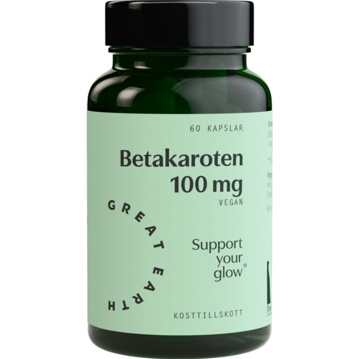 Great Earth Betakaroten är ett kosttillskott som innehåller 100 mg betakaroten per kapsel från den naturliga källan Blakeslea trispora. Betakaroten är ett förstadium till A-vitamin och fungerar som en antioxidant och bidrar till att bibehålla normal hud. För att öka upptaget av betakaroten i kroppen har Great Earth tillsatt MCT-olja från kokosnöt.