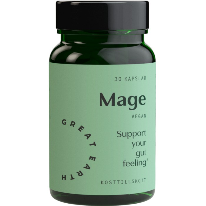 Great Earth Mage är ett kosttillskott med mjölksyrabakterier. Great Earth Mage innehåller MicrobiomeX®, ett naturligt extrakt från grapefrukt och apelsin, som består av två flavonoider: hesperidin och naringin. Det vegetabiliska enzymkomplexet DigeZyme består av en blandning av 5 olika matsmältningsenzymer. Enzymer hjälper oss att bryta ner maten vi äter i mindre beståndsdelar, samtidigt som de hjälper till att maximera näringsupptaget. Mage innehåller även 5 miljarder mjölksyrabakterier från 5 olika bakteriestammar samt kalcium som bidrar till matsmältningsenzymernas normala funktion.