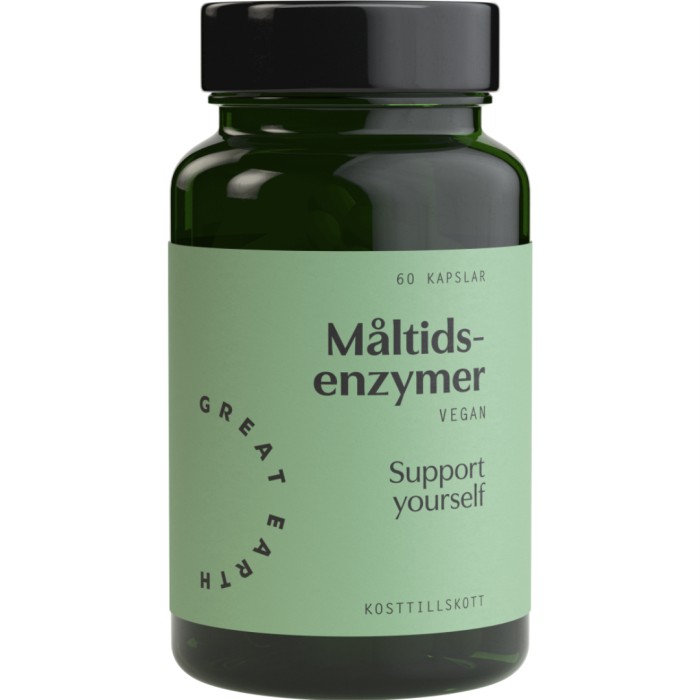 Great Earth Måltidsenzymer är ett brett enzymtillskott som kan tas dagligen, eller vid behov för att ge stöd till matsmältningen. Vegan Enzymes innehåller en blandning av 9 olika enzymer från endast vegetabiliska källor och stöder nedbrytningen av kolhydrater, protein, fett, laktos och fiberrika grönsaker.
