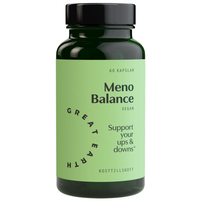 Great Earth Meno Balance är ett kosttillskott för kvinnor i klimakteriet. Meno Balance innehåller vitamin B6 som bidrar till att reglera hormonaktiviteten. Meno Balance har en unik DuoCap, en kapsel i kapsel, och innehåller förutom vitamin B6 även nattljusolja, linfrö (med naturliga fytoöstrogener), jamsrot, rödklöver och salvia.