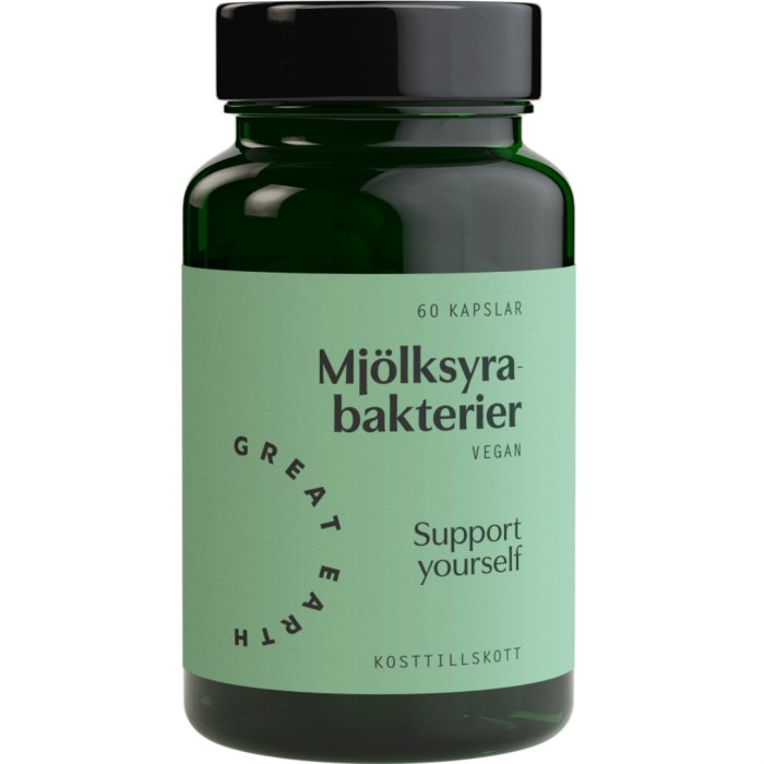 Great Earth Mjölksyrabakterier är ett kosttillskott som innehåller 10 miljarder mjölksyrabakterier per kapsel från nio olika bakteriestammar, samt FOS (fruktooligosackarider) och inulin som fungerar som mat för bakterierna. Great Earth Mjölksyrabakterier är vegansk och går bra att ta även om du är laktosintolerant eller mjölkproteinallergiker.