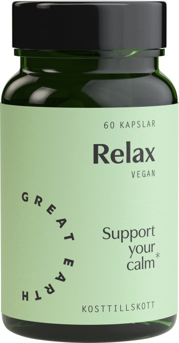 Great Earth Relax är ett kosttillskott som innehåller saffran, citronmeliss, pantotensyra samt kamomill.