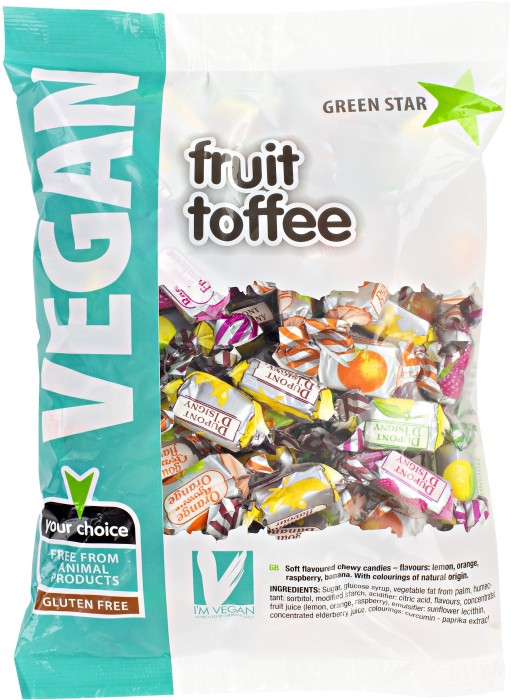 Green Star Vegan Fruit Toffee är mjuka fruktkolor i smakerna citron, apelsin, hallon och banan.