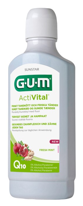 Gum Activital munskölj bidrar till ett friskt tandkött och friska tänder. Gum Activital munskölj innehåller co-enzym Q10, granatäpple för att skydda tandkött från fria radikaler. Ingredienserna ingefära och kamomill (bisabolol) hjälper till att stärka tandköttet och skydda mot tidiga tecken av tandköttsproblem.