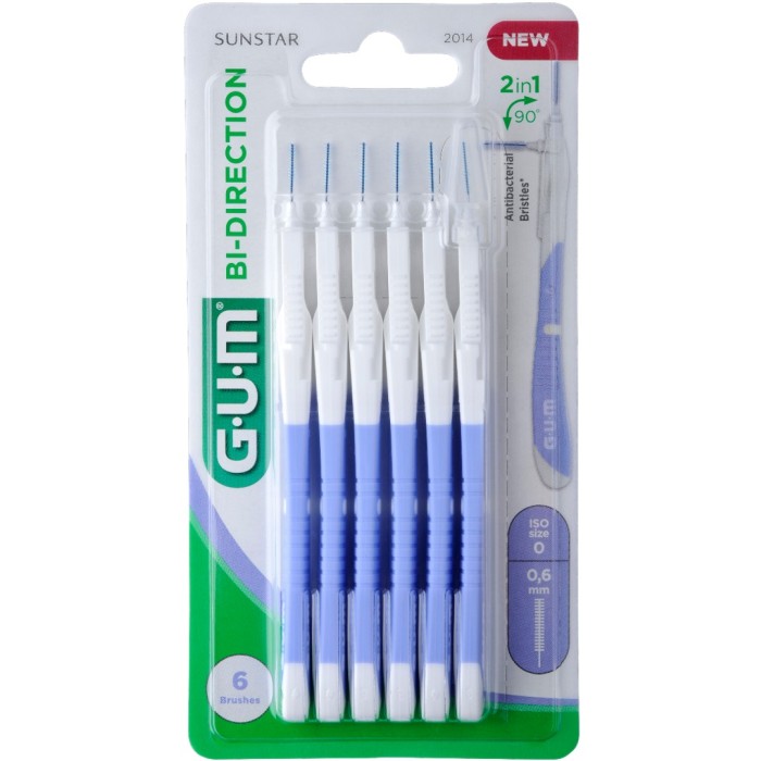 GUM Bi-Direction mellanrumsborste förenklar rengöringen mellan tänderna. Borsthuvudet kan ställas in i två olika positioner vilket underlättar åtkomsten av de bakre tänderna.