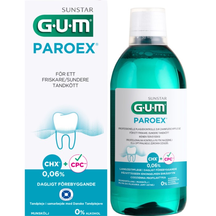 GUM Paroex Munskölj ger långsiktigt skydd mot tandköttsproblem och reducerar plack-bildning. Paroex Munskölj riktar sig mot tidiga stadier av tandköttsproblem. Bibehåller en god munhälsa hos patienter med ortodonti, implantat eller protes.