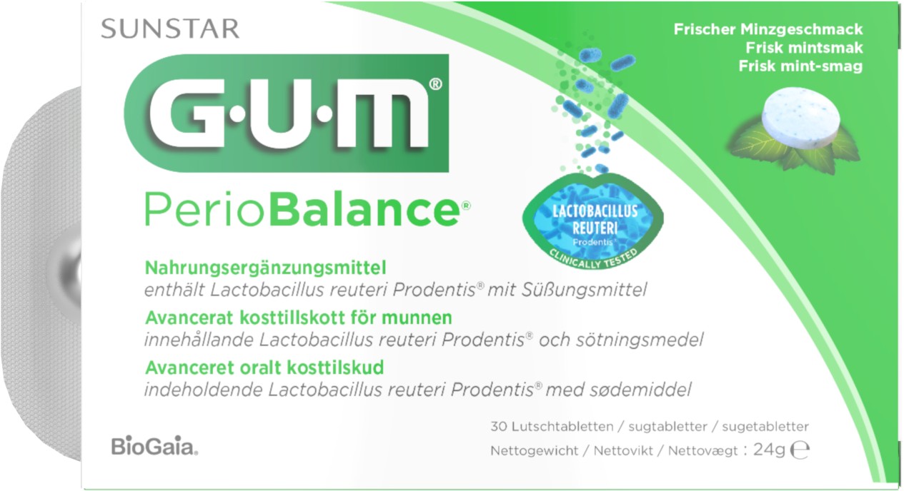 GUM Periobalance sugtabletter är ett kosttillskott för munnen med bakterien Lactobacillus reuteri Prodentis som fäster på munnens slemhinnor. En Periobalance sugtablett innehåller minst 200 miljoner levande Lactobacillus reuteri Prodentis.