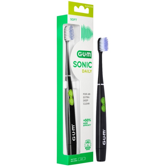 GUM Sonic är en manuell batteridriven tandborste, en sonisk batteritandborste med 12 000 rörelser per minut. De soniska vibrationerna ger en extra effektiv plackborttagning på ett skonsamt sätt. Borsten har avsmalnande koniska bortsstrån för att nå långt och ge en bra plackborttagning vid tandköttskanten.