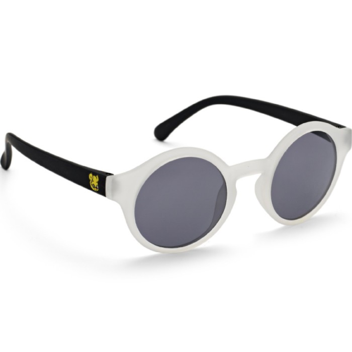 Haga Optiks barnsolglasögonmodell "Bamse Teddy" är en tuff rund modell, som har en transparent frostad front och svarta skalmar av polykarbonat, framtagen för barn ca 3-7 år . På skalmen finns en bild av Teddy. Linsen är grå.