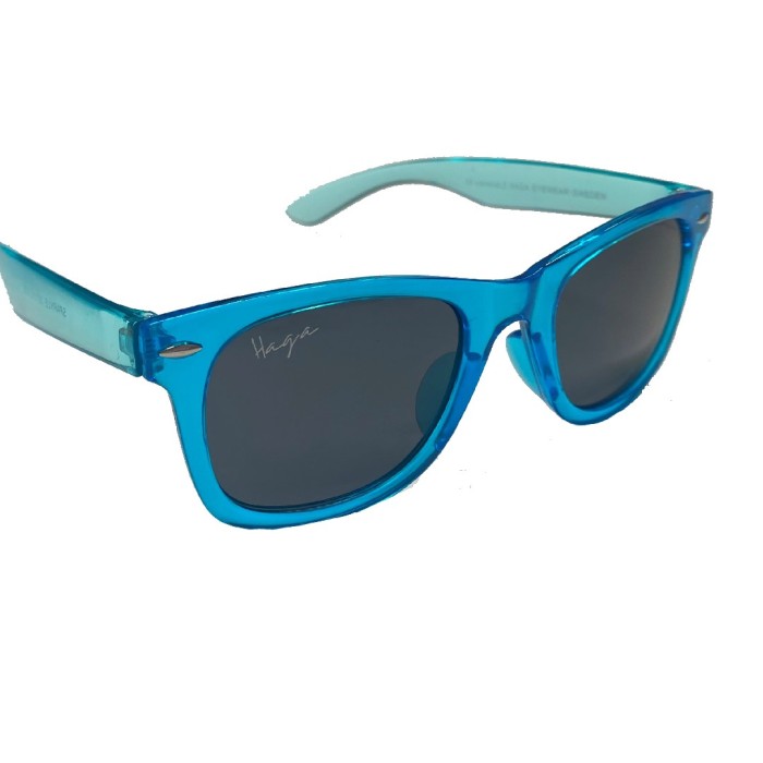 Haga Eyewear Sparkle Frosty Blue är solglasögon med blå ram och grå lins. Solglasögonen har högkvalitativa linser med 100% UVA+ B skydd (UV400). De är CE-märkta och antinickelbehandlade.