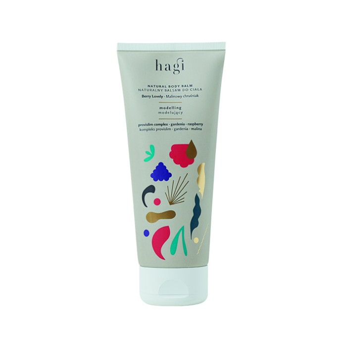 Hagi Natural Modelling Body Balm Berry Lovely är en "skulpterande" bodylotion med aktiva substanser som stramar upp huden. Lotionen innehåller bland annat monoi-olja, sheasmör, vindruvskärnolja, och risolja och har en bärig doft.