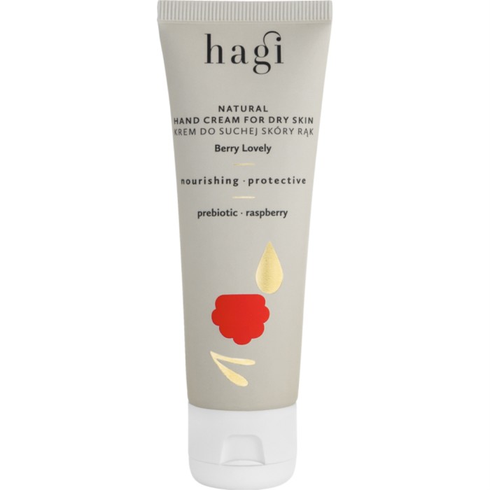 HAGI Natural Hand Cream for Dry Skin är en kräm för torra händer. Krämens formulering med vårdande ingredienser stärker hudens mikrobiom och är rik på skyddande lipider. HAGI handkräm innehåller fuktgivande inulin, utjämnande fruktextrakt som ger en jämnare yta på händerna, och lugnande panthenol. Berry Lovely handkräm har en bärig doft av hallon. Vegansk.