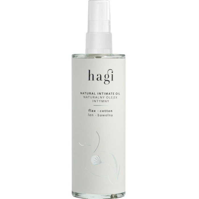 HAGI Natural Intimate Oil är en intimolja med bomullsextrakt, linfröolja (rik på omegafettsyror), mild mandelolja och lugnande vindruvskärnolja. Intimoljan har en mild sensuell doft och är framtagen för att du ska känna dig fräsch hela dagen.