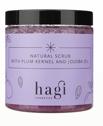 Hagi Natural Scrub with Plum Kernel & Jojoba Oil är en saltskrubb som tar bort döda hudceller och har en härlig doft av plommon