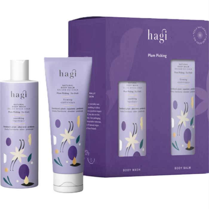 Presentkit från Hagi med Plum Picking Wash Gel & Body Balm - en duschgel och en hudlotion med doft av plommon med varma toner av vanilj.