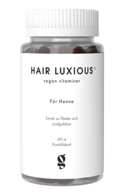 Hair Luxious för henne Gummies är ett veganskt kosttillskott med ingredienser som selen, zink och flera B-vitaminer, bland annat biotin. Biotin bidrar till att bibehålla normalt hår. Tuggvänliga gummies med smak av fläder och jordgubb. Vegansk.