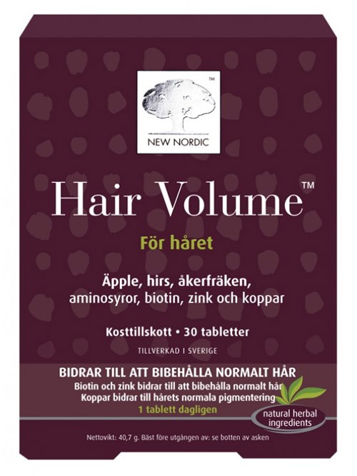 Med åldern är det vanligt att håret blir tunnare delvis beroende på naturliga förändringar som ofta kan hänföras till hormoner, stress eller kostförändringar. Hair Volume är baserat på en innovativ sammansättning med äpple och hirs. Hair Volume innehåller aminosyror, åkerfräken, zink, aminosyror och mineraler som inkluderar koppar samt vitaminer.