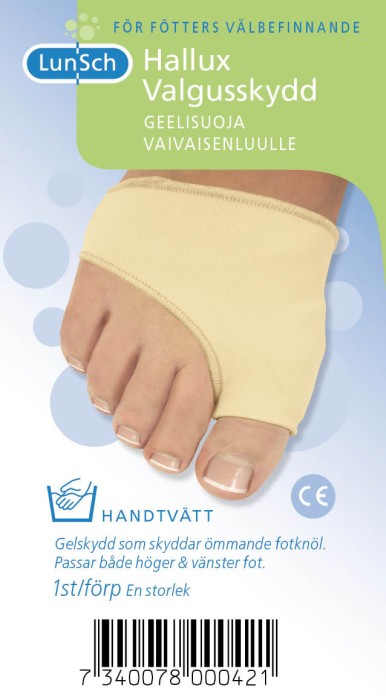 Detta är ett Hallux Valgus-skydd som är elastiskt och har en gelkudde för att lindra vid öm knöl vid stortån. Skyddet innehåller en gel som bidrar till att minska tryck och friktion. Passar både höger och vänster fot.