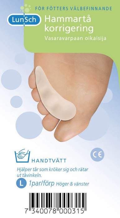 Denna hammartåkorrigering från LunSch består av ett mjukt gelstöd som hjälper till när tår har en tendens att kröka sig som vid exempelvis hammartåproblem. En ögla träs på tåns ovansida och avlastningen sitter då under tårna. 1 höger och 1 vänster/förpackning. Handtvätt. Storlek large.