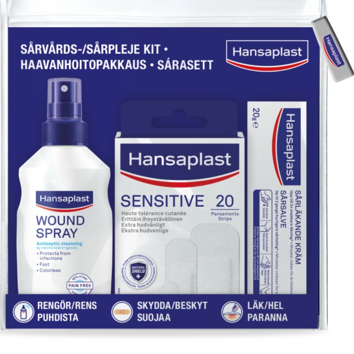 Hansaplast Sårvårdskit innehåller Hansaplast-produkter för en optimal sårläkning som du använder snabbt och enkelt för att hålla dig till sårvårdsrutin ”Rengör - Skydda – Läk”. Rengör såret med Hansaplast Wound Spray, skydda med Sensitive plåster och läk med Hansaplast Wound Healing Ointment.