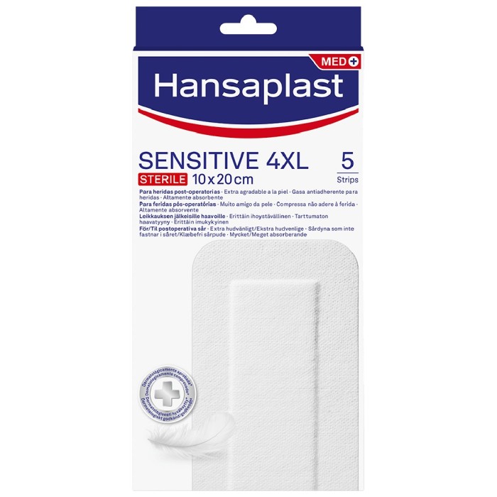 Hansaplast Sensitive 4XL är sterila sårförband för skydd av större och postoperativa sår. Hansaplast Sensitive 4XL har storlek 10 cm x 20 cm.
