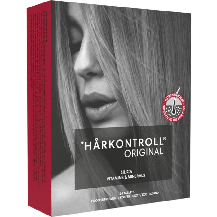 Hårkontroll är ett kosttillskott för hår och naglar. Hårkontroll innehåller biotin som bidrar till att bevara normalt hår, zink och selen som bidrar till att bevara normalt hår och normala naglar, och koppar som bidrar till att bevara hårets normala pigmentering. Innehåller även extrakt av kiselrikt bambu, hirs samt andra vitaminer och mineraler.