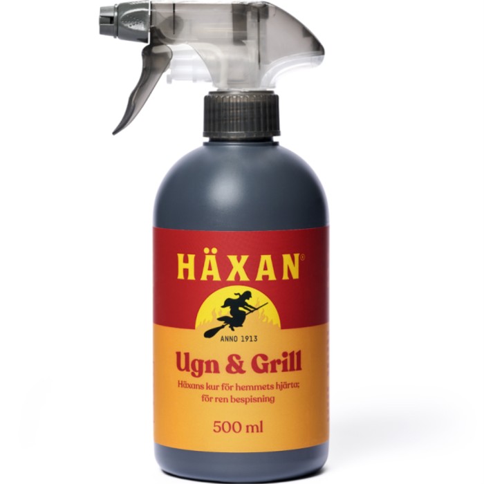 Häxan Ugn & Grill är ett avfettningsmedel som undanröjer fastbrända beläggningar, fettfläckar och sot. Kan användas till grillen och till ugnens alla delar, dvs galler, plåt, häll och fläktkåpa. Oparfymerad och utan färgämnen.