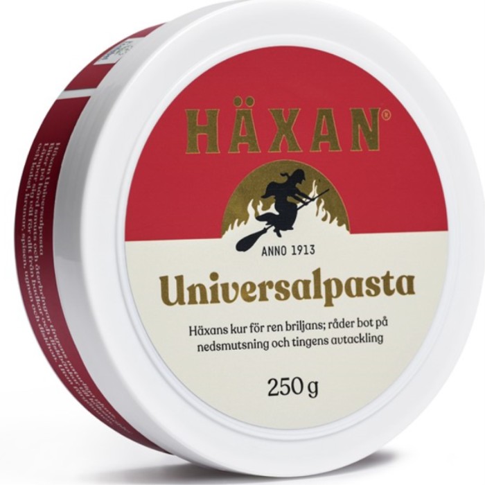 Häxan Universalpasta kan användas till allt från badkar till diskbänkar, kakel och kranar. Universalpastan biter hårt på smuts och tar fram ytornas naturliga glans.