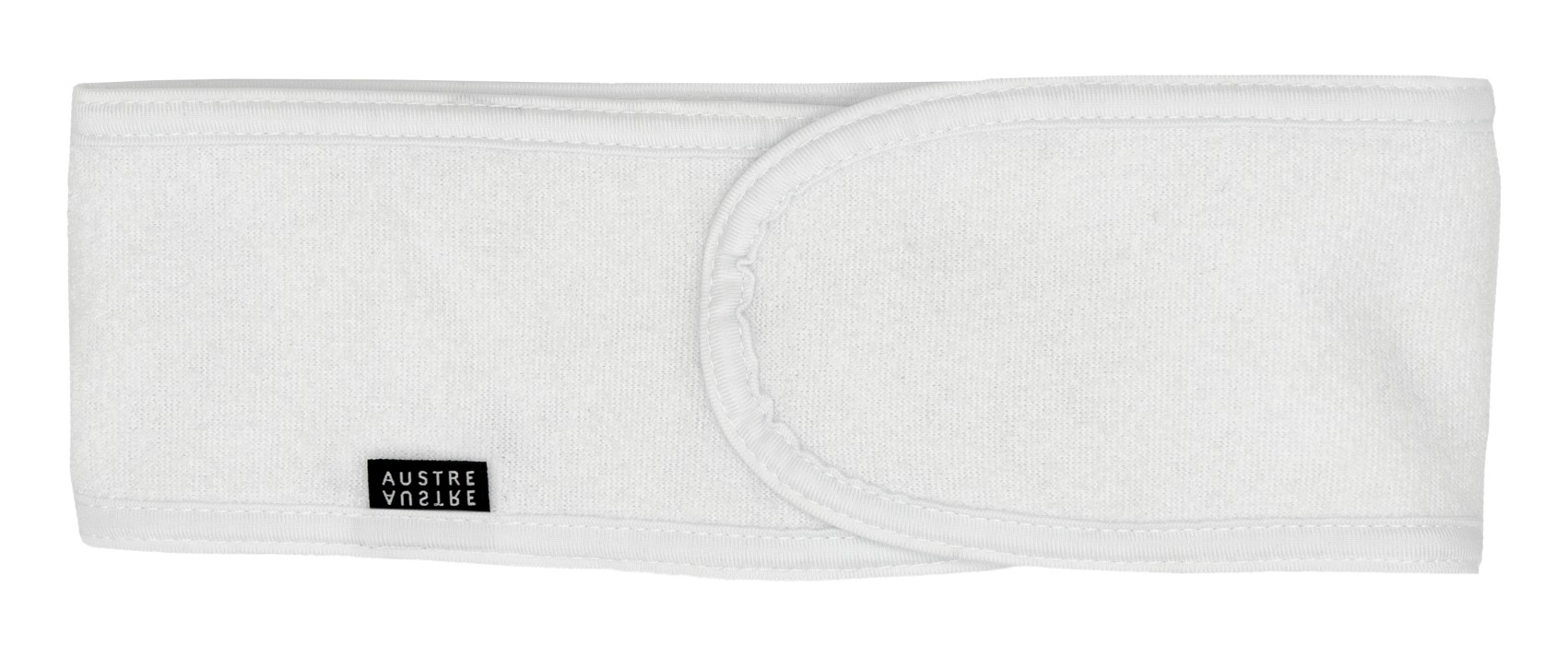 AUSTRE Hårband håller håret på plats när du gör din hudvårdsrutin eller lägger makeup. Hårbandet är i polyester och har ett justerbart kardborreband. Kan tvättas i tvättmaskin 30°C.