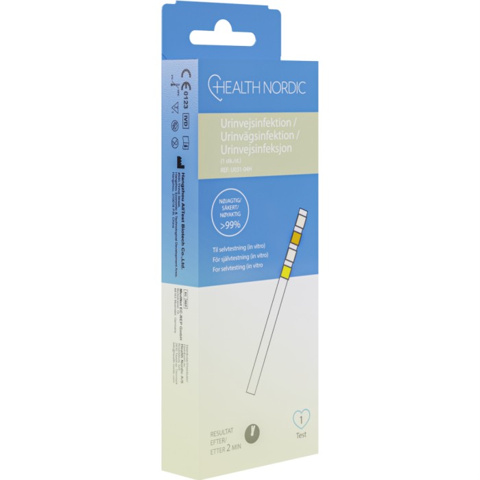 Health Nordic Urinvägsinfektion självtest är ett säkert och tillförlitligt snabbtest för urinvägsinfektion som är 99% exakt. Resultatet kan avläsas efter 2 minuter. Självtestet indikerar om det finns symtom på urinvägsinfektion/blåskatarr. Testet kan användas av både kvinnor och män.