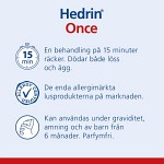 Hedrin Once gnuggas in i torrt hår, ända ner i hårbotten. Låt det verka i 15 minuter. Låt håret lufttorka (får ej fönas). Kamma inte håret medan behandlingen verkar. Direkt efter behandlingen ska man använda schampo. Det är viktigt att schampot appliceras före vattnet, annars kan det vara svårt att skölj Hedrin Once ur håret. Håret kan behöva tvättas två gånger. Man behöver inte kamma håret efteråt. Behandlingen behöver inte upprepas.