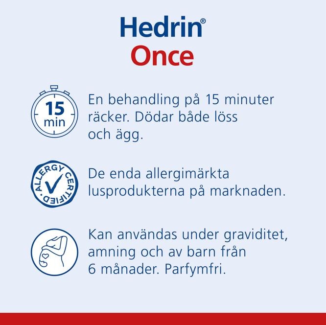 Hedrin Once Gel är ett lusmedel som bara behöver användas en gång för maximal effekt. Hedrin Once Gel har en lättflytande gel-formulering och används i torrt hår. Fördelas enkelt jämt över håret och ska tvättas ur efter 15 minuter. Gelen dödar både löss och ägg. (Direkt efter behandlingen ska man använda schampo. Det är viktigt att schampot appliceras före vattnet, annars kan det vara svårt att skölj Hedrin Once ur håret. Håret kan behöva tvättas två gånger.)
