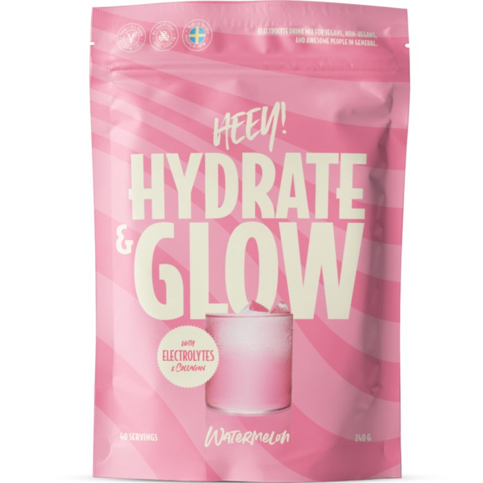 Heey! Hydrate & Glow är ett elektrolyttillskott som kombinerar vätskebalans med skönhetstillskott i en Dual Action Formula. Pulvret innehåller en effektiv mix av elektrolyter, och är berikat med noga utvalda ingredienser för att stödja hudens elasticitet, fuktighet och utstrålning. Elektrolytmixen ger en effektiv hydrering och återhämtning.