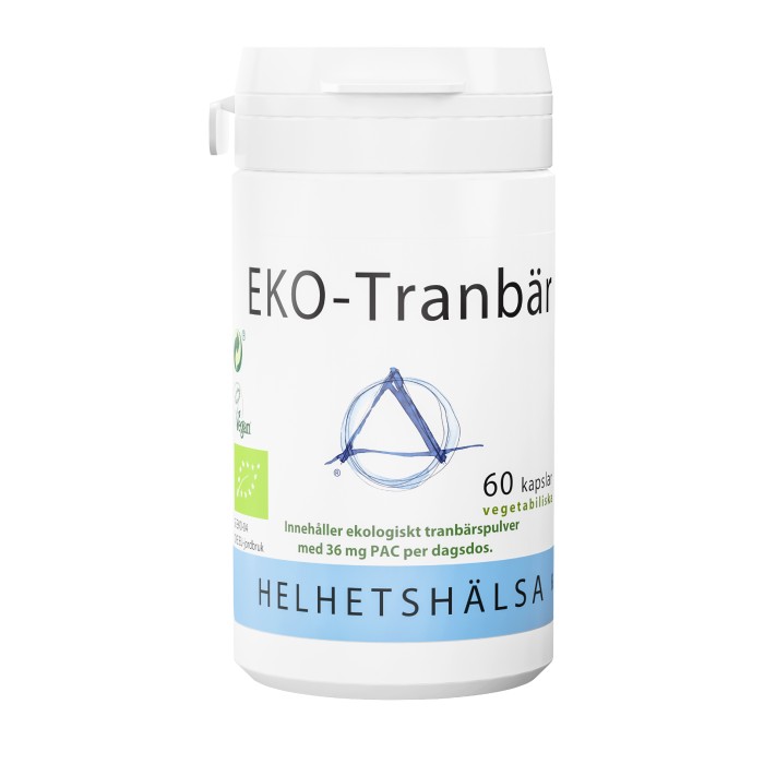 Helhetshälsa EKO-Tranbär är ett kosttillskott i form av kapslar med tranbärspulver från ekologiska, hela, torkade tranbär med högt PAC-innehåll, 36 mg PAC/dagsdos. PAC, (proantocyanidiner) är en sorts flavonoider som ger tranbäret dess unika egenskaper. Tranbärskapslarna innehåller ekologiskt tranbärspulver av hela bär. 516 mg tranbärspulver/dagsdos (2 kapslar)