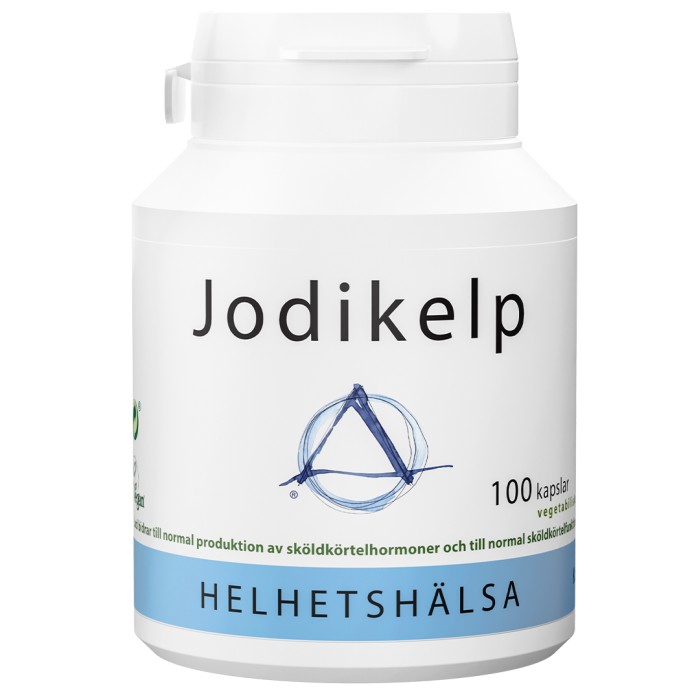 Ingredienser: Fyllnadsmedel (mikrokristallin cellulosa), knöltång (Ascophyllum nodosum) med kaliumjodid. Vegetabilisk kapsel tillverkad av cellulosa. Kelp är ett samlingsnamn för de stora brunalgerna. Den Kelp som används i Jodikelp heter Ascophyllum nodosum och är mycket jodrik. Registrerad av Vegan Society.