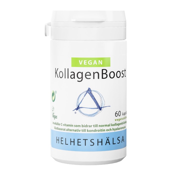 Helhetshälsa KollagenBoost är ett kosttillskott som innehåller kondroitin (en beståndsdel i kollagen), hyaluronsyra, C-vitamin och mangan. Kollagen utvinns normalt från djur, men Helhetshälsa KollagenBoost är veganskt och innehåller Phytodroitin™ som utvinns från alger. Även hyaluronsyran är vegansk (HAPLEX®Plus*). KollagenBoost innehåller även C-vitamin som bidrar till normal kollagenbildning och mangan som bidrar till normalt bildande av bindväv.